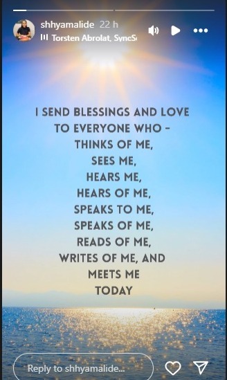 श्यामाली ने पोस्ट में लिखा,"मैं उन सभी को आशीर्वाद और प्यार भेजती हूं जो मेरे बारे में सोचते हैं, मुझे देखते हैं, मुझे सुनते हैं, मेरे बारे में सुनते हैं, मुझसे बात करते हैं, मेरे बारे में पढ़ते हैं, मेरे बारे में लिखते हैं और आज मुझसे मिलते हैं।" हालांकि उन्होंने पोस्ट में किसी का नाम नहीं लिया, लेकिन ठीक इसी दिन सामंथा रुथ प्रभु ने राज निदिमोरु के साथ एक हवाई जहाज में ट्रेवल करते हुए एक सेल्फी पोस्ट की जिसमें वो उनके कंधे पर सिर रखकर आराम करती नजर आ रही थीं।