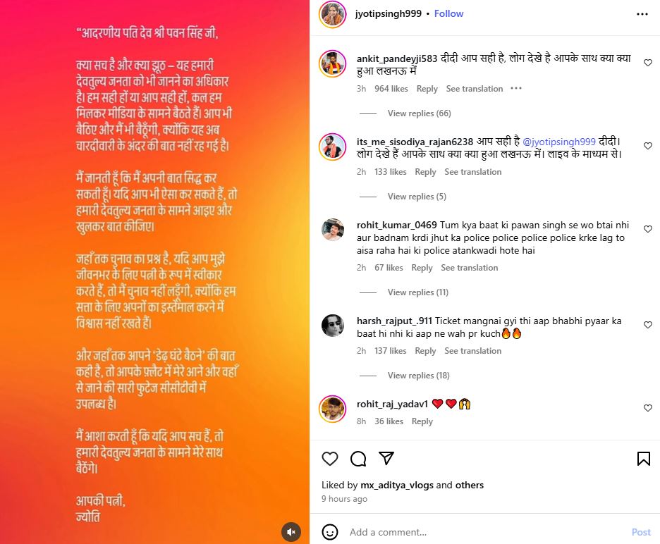 पवन सिंह की इस बयान बाजी के बाद उनकी पत्नी ज्योति भी शांत नहीं रहीं। उन्होंने लिखा, "आदरणीय पतिदेव श्री पवन सिंह जी, क्या सच है क्या झूठ ये हमारी देवतुल्य जनता को भी जानने का अधिकार है। हम सहीं हैं या आप, कल हम मिलकर मीडिया के सामने बैठते हैं, क्योंकि अब यह चार दीवारी के अंदर की बात नहीं रह गई है। मैं जानती हूं कि मैं अपनी बात सिद्ध कर सकती हूं, अगर आप भी कर सकते हो तो हमारी जनता के सामने आइए और खुलकर बात कीजिये"।