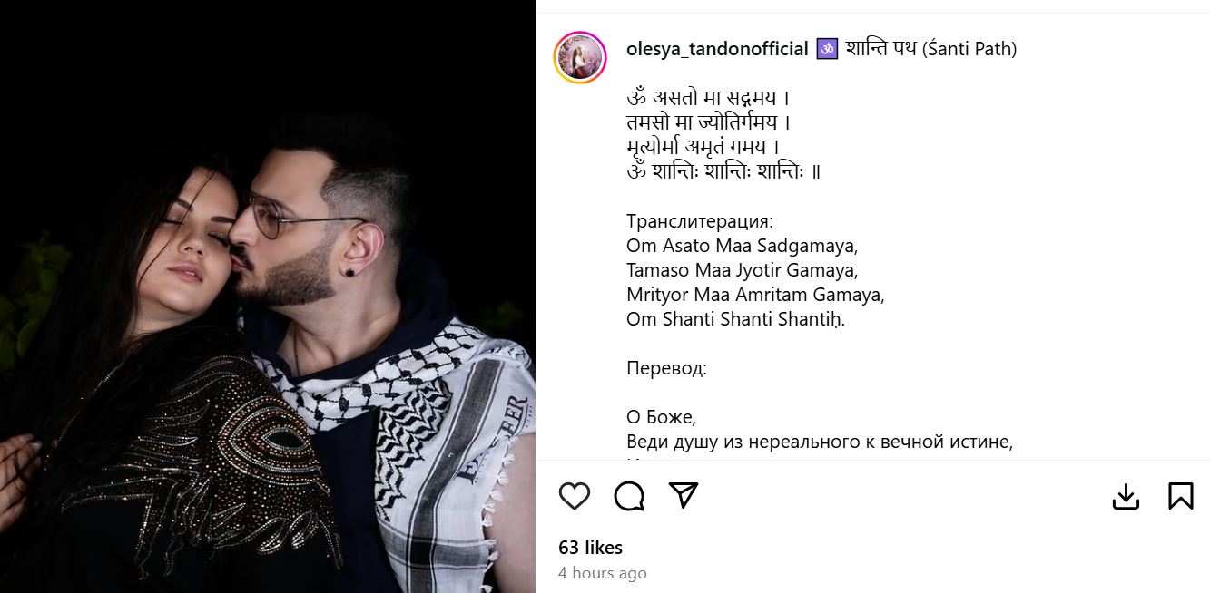 ऋषभ टंडन के निधन के बाद से ही ओलेस्या सोशल मीडिया पर अपने पति की याद में भावुक पोस्ट शेयर कर रही हैं। 22 अक्टूबर को उन्होंने अपने पति ऋषभ के साथ ढेर सारी फोटोज शेयर की थीं और एक भावुक नोट लिखा था। उन्होंने कहा था, "मुझे शब्द नहीं मिल रहे हैं। आपने मुझे छोड़ दिया। मेरे प्यारे पति, दोस्त, पार्टनर, मैं कसम खाती हूं कि मैं आपके सभी सपने पूरे करूंगी। आप मरे नहीं हैं, आप मेरे साथ हैं, मेरी आत्मा, मेरा दिल, मेरा प्यार, मेरे राजा।"